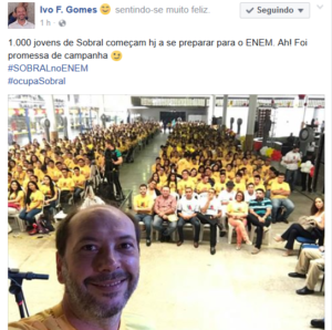 Por volta do meio dia, após o término da aula inaugural, Ivo Gomes comemorou em seu perfil no Facebook o início do cursinho #SobralnoEnem. De acordo com Ivo, o curso preparatório “Foi promessa de campanha”.