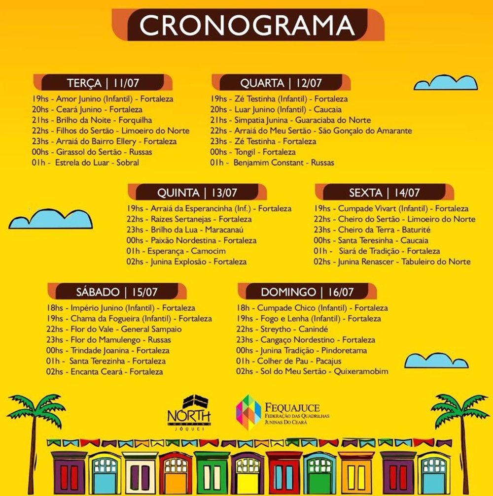 Finalizando os festejos do São João cearense 2017, o 15º Festival Cearense de Quadrilhas Juninas acontece entre os dias 11 e 16 de julho, a partir de 18h, no North Shopping Jóquei. No domingo, haverá o resultado da quadrilha campeã do Ceará.