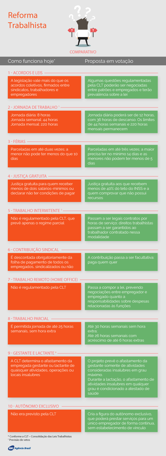 A proposta altera mais de 100 pontos da Consolidação das Leis do Trabalho (CLT), permitindo mudanças como a prevalência do acordado entre patrões e empregados sobre o legislado nas negociações trabalhistas. A sessão chegou a ser iniciada às 11h de ontem (11), mas as senadoras da oposição ocuparam a Mesa do Senado e impediram que o presidente da Casa, Eunício Oliveira, conduzisse os trabalhos, que foram retomados apenas no início da noite.]