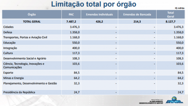 O restante da verba contingenciada refere-se a emendas impositivas de bancada (R$ 214,3 milhões), emendas impositivas individuais (R$ 426,2 milhões) e recursos do Legislativo e do Judiciário (R$ 7,4 milhões).