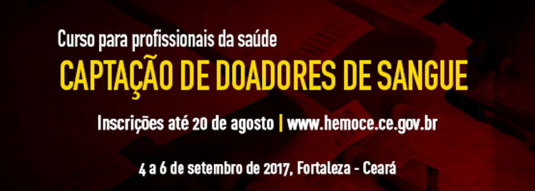 O Centro de Hematologia e Hemoterapia do Ceará (Hemoce), em parceria com a Escola de Saúde Pública, ambos do Governo do Ceará, lança o primeiro Curso de Captação de Doadores de sangue. A capacitação será nos dias 4, 5 e 6 de setembro, das 8 às 17 horas, no auditório do Hemoce. O curso, que tem 200 vagas, é para profissionais da área da saúde e as inscrições são gratuitas. Os interessados devem preencher a ficha de inscrição e enviá-la até o dia 20 de agosto para o e-mail: recursos.humano@hemoce.ce.gov.br.