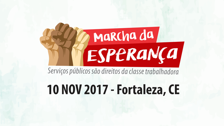 A Federação dos Trabalhadores do Serviço Público Municipal do Estado do Ceará (Fetamce) está realizando uma grande mobilização para a 8ª Marcha dos Servidores Municipais do Ceará, que leva o tema: “Marcha da Esperança – Serviços Públicos são Direitos da Classe Trabalhadora”. O evento acontece nesta sexta-feira, dia 10 de novembro de 2017, com concentração na Praça da Bandeira – Centro de Fortaleza, às 8 horas.