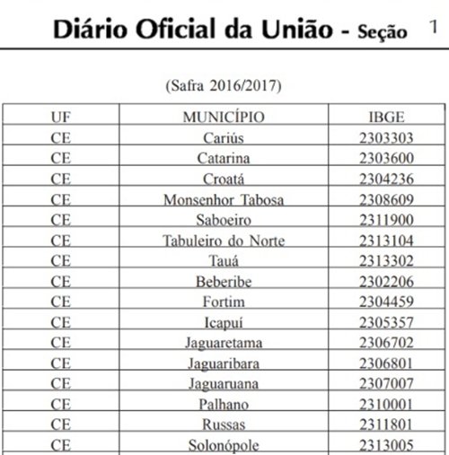 A edição desta quinta-feira, 16, do Diário Oficial da União autorizou, oficialmente, a liberação do pagamento do Seguro Garantia-Safra para os beneficiados pelo Programa dos estados do Ceará e Minas Gerais.