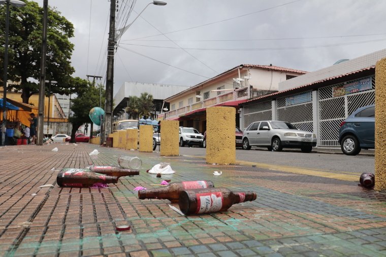 FORTALEZA, CE, BRASIL, 10-03-2018: Praça da Gentilândia na manhã após a chacina. Viaturas patrulhavam o local, o bar da onde aconteceu a tragédia "Loura da Mombaça" estava fechado e a feira abriu normalmente. No local ainda restavam vestígios de garrafas quebradas pelo chão. Chacina ocorrida na Gentilândia e imediações. (Foto: Júlio Caesar/O POVO) *** Local Caption *** Publicada em 11/03/2018 - RPM 05