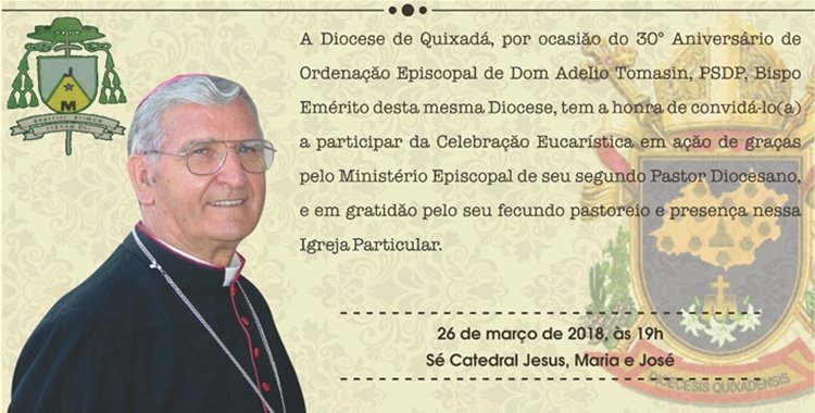 A Diocese de Quixadá realizará na próxima segunda-feira, 26, uma Celebração Eucarística em ação de graças ao 30º Aniversário de Ordenação Episcopal de Dom Adélio Tomasin, Bispo Emérito da Diocese.