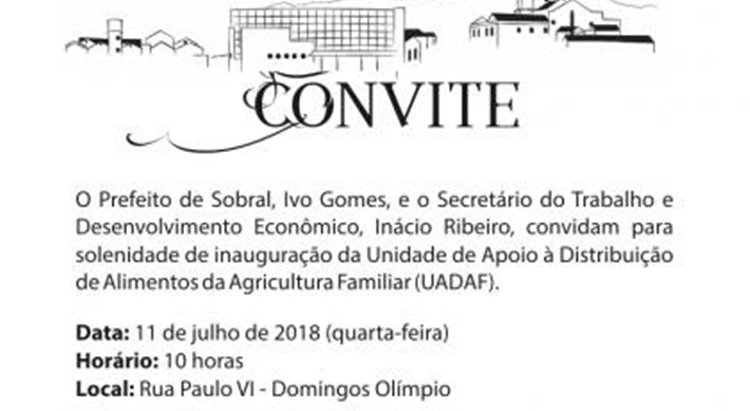 A Prefeitura de Sobral, por meio da Secretaria do Trabalho e Desenvolvimento Econômico (STDE), irá realizar a inauguração da Unidade de Apoio à Distribuição de Alimentos da Agricultura Familiar (UADAF), dia 11 de julho, a partir das 10 horas.