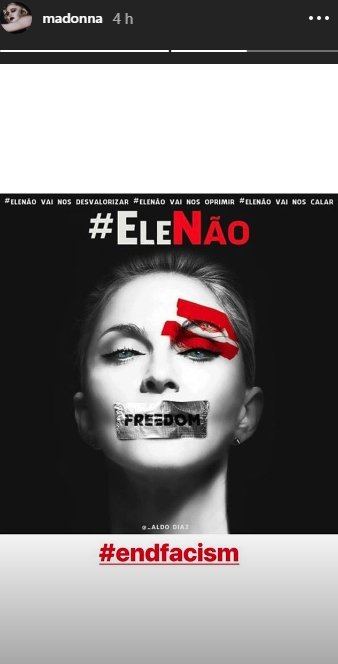 Na manhã desta sexta-feira, 28, a cantora Madonna utilizou o Instagram Stories, para se posicionar contra o candidato à Presidência da República Jair Bolsonaro (PSL). Ela aderiu à campanha #EleNão e publicou uma foto em que aparece com a boca coberta e a palavra “liberdade”.