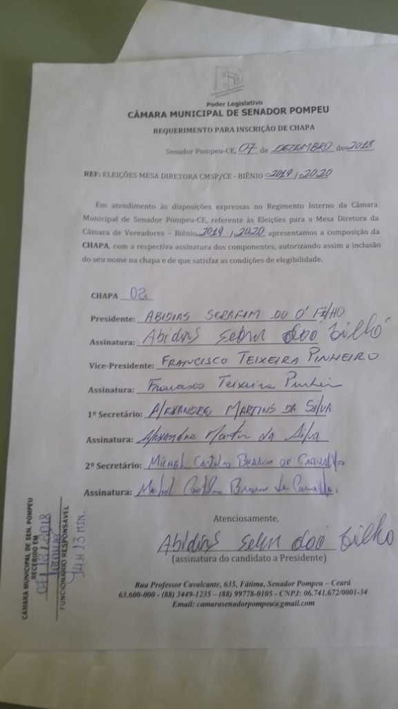 Home Política Câmara dos Vereadores de Senador Pompeu terá somente uma única chapa concorrendo...