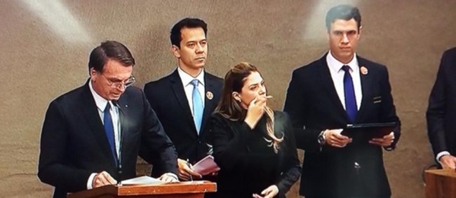Bolsonaro e Mourão foram levados à sessão pelos ministros do TSE Luís Roberto Barroso e Tarcísio Vieira de Carvalho Neto. Foram saudados com aplausos pelos presentes. Em seguida, a Banda dos Fuzileiros Navais executou o Hino Nacional. Bolsonaro acompanhou o Hino com a mão no peito.