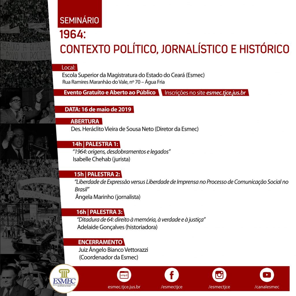 Com o objetivo de discutir as implicações políticas, jornalísticas e históricas de 1964 no Brasil e na América Latina, a Escola Superior da Magistratura do Estado do Ceará (Esmec) promoverá, no dia 16 de maio, a partir das 14h, o Seminário 1964: Contexto político, jornalístico e histórico.