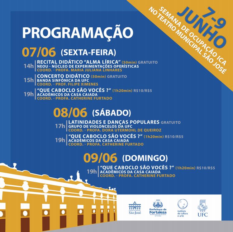 De 7 a 9 de junho, diversos grupos artísticos do Curso de Música da Universidade Federal do Ceará promovem uma série de apresentações e concertos didáticos na Semana de Ocupação do Instituto de Cultura e Arte (ICA). A programação ocorrerá no Teatro São José (Rua Rufino de Alencar, 299, Centro) e será aberta ao público, com sessões gratuitas e ingressos vendidos a preços populares.