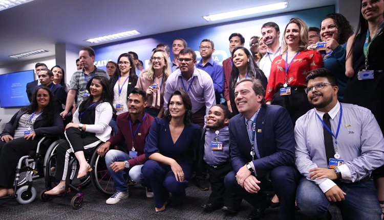 A Caixa Econômica Federal contratou 182 empregados aprovados em concurso realizado em 2014, dos quais 174 têm alguma deficiência. Os novos funcionários vêm fortalecer o quadro após uma série de demissões e irão ainda contribuir para que o banco cumpra o percentual mínimo de 5% de pessoas com deficiência. Eles foram recebidos em cerimônia ontem, 15, que contou com a presença da primeira dama, Michelle Bolsonaro, em Brasília.
