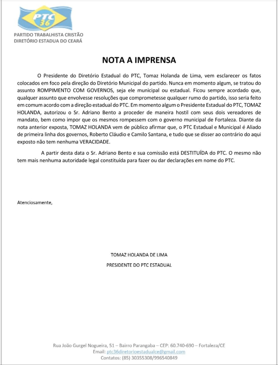 “Nunca, em momento algum, se tratou do assunto rompimento com governos, seja ele municipal ou estadual. Em momneto algum, o presidente estadual do PTC, Tomaz Holanda, autorizou o senhor Adriano Bento a proceder de maneira hostil com seus dois vereadores [Cláudia Gomes e Lucimar Martins] de mandato, bem como impor que os mesmos rompessem com o governo municipal de Fortaleza”, diz a nota.
