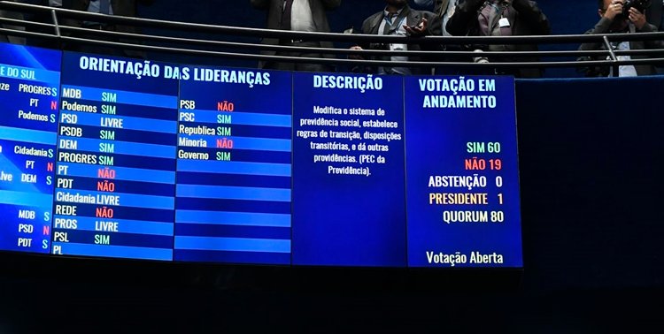Após pouco mais de três horas de discussão, o Plenário do Senado aprovou o texto-base da reforma da Previdência em segundo turno. Às 19h22, o presidente da Casa, Davi Alcolumbre (DEM-AP), proclamou o resultado. A proposta de emenda à Constituição (PEC) foi aprovada por 60 votos contra 19.