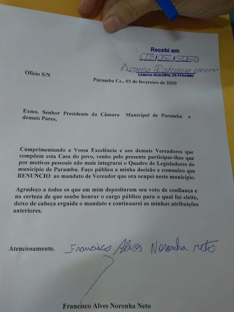 Na manhã de hoje, 03, o vereador Francisco Alves Noronha Neto, de Parambu, protocolou ofício renunciando ao seu mandato. A informação é do Blog do Wilrismar.