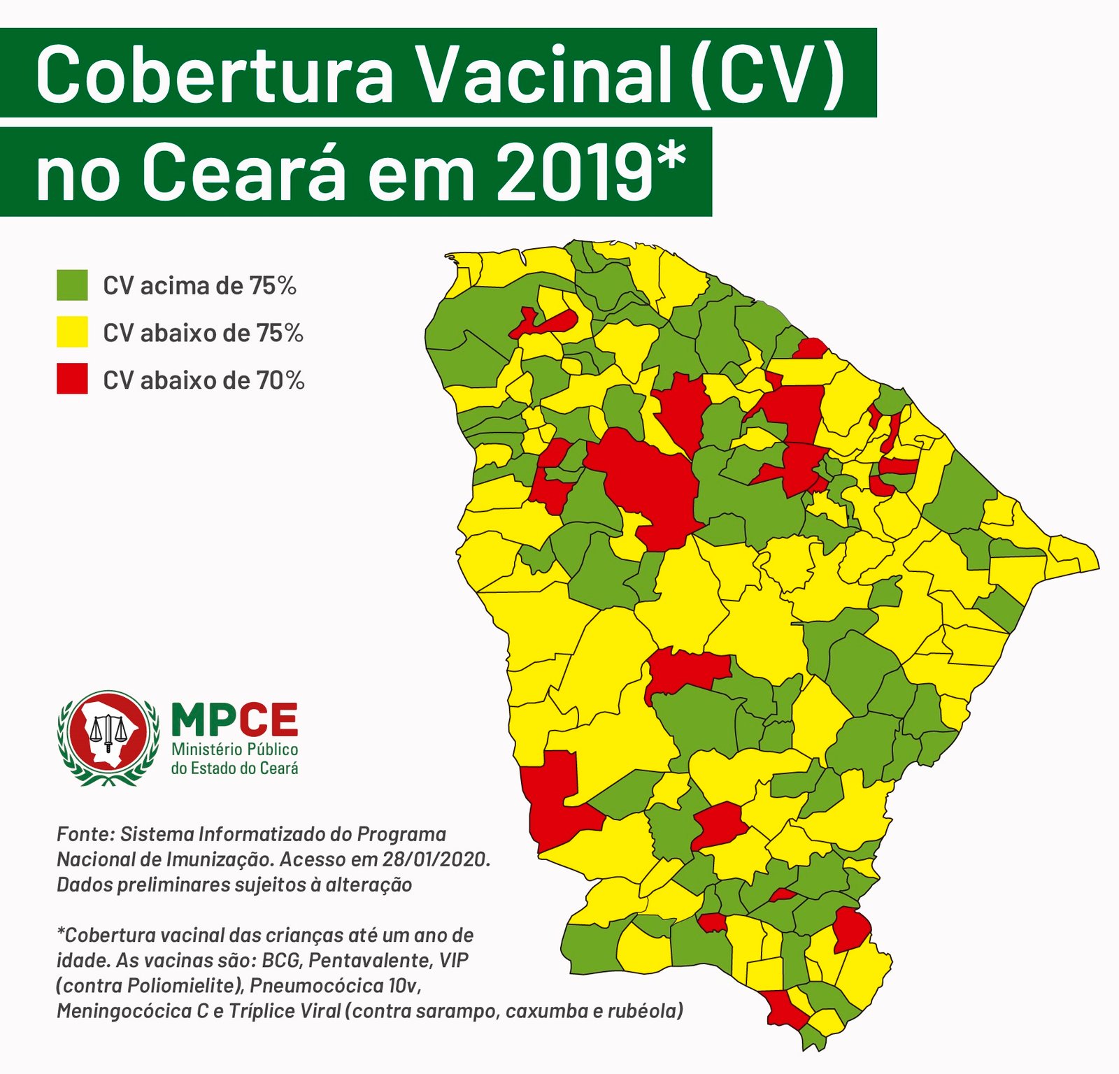 O MPCE verificou, ainda, que, em 2019, 106 cidades não alcançaram 75% da cobertura vacinal nas seis principais vacinas: BCG, Pentavalente, VIP (contra Poliomielite), Pneumocócica 10v, Meningocócica C e Tríplice Viral (contra sarampo, caxumba e rubéola). Dentre esses 106 municípios, 21 não atingiram sequer 70% de cobertura, embora a meta seja de 90% para a BCG e 95% para os demais tipos de vacina. As 21 cidades onde a situação é mais grave são: Barreira, Barro, Caridade, Granjeiro, Ipu, Irauçuba, Itaitinga, Jardim, Jucás, Maracanaú, Mulungu, Nova Olinda, Pacajus, Paracuru, Parambu, Pedra Branca, Pentecoste, Reriutaba, Santa Quitéria, São Luís do Curu e Uruoca.