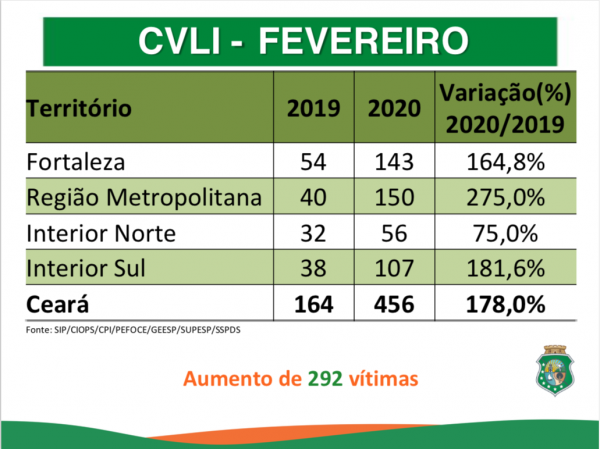O mês de fevereiro de 2020 registrou um aumento de 178% nos Crimes Violentos Letais Intencionais (CVLI) quando comparado com o mesmo mês do ano passado. Foram registrados 456 homicídios (dolosos/feminicídios, latrocínios e nas lesões corporais seguidas de morte) contra 164 de fevereiro de 2019. Foram 292 vítimas fatais a mais do que o registrado no ano passado. O índice foi alavancado pelos 11 dias do mês em que parte dos policiais militares paralisaram as atividades. Durante o motim, foram contabilizadas 289 mortes do dia 19 ao dia 29 de fevereiro, o que corresponde a 63,4% das mortes do mês de fevereiro de 2020. A paralisação chegou ao fim apenas no dia 1º de março, que registrou mais 23 mortes, totalizando 312 mortes durante o motim.