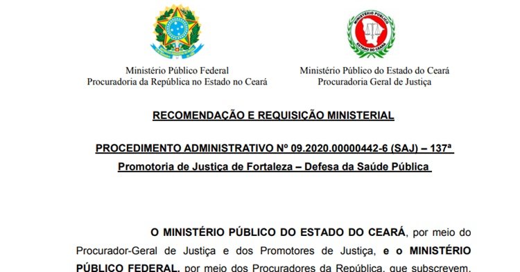 Uma recomendação conjunta expedida pelo Ministério Público Estadual e pelo Ministério Público Federal nessa sexta-feira, 27, requer que a Polícia Militar adote providências para impedir a realização de carreatas que estavam marcadas para acontecer durante o fim de semana em Fortaleza, Juazeiro do Norte e em outras cidades, a favor da reabertura ampla do comércio e contra as medidas de isolamento social estabelecidas em decretos do governador Camilo Santana.