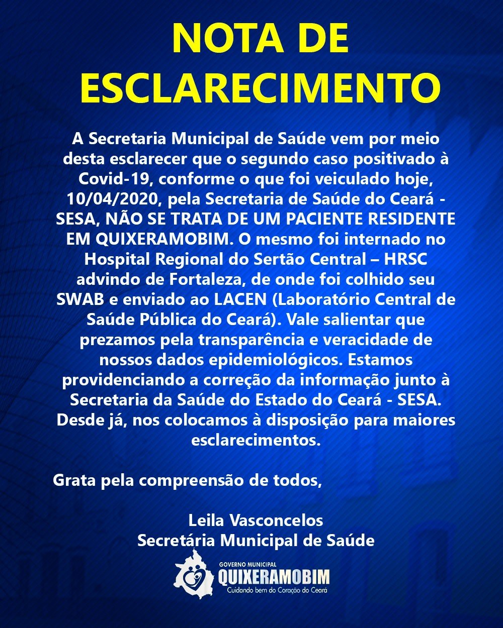 A Secretaria de Saúde de Quixeramobim publicou nota de esclarecimento acerca do novo caso de coronavírus confirmado pela Secretaria da Saúde do Estado (Sesa) no município.