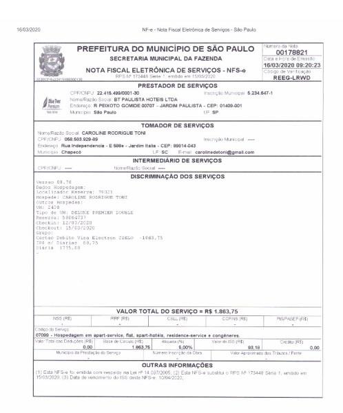 Entre os dias 12 e 15 de março, a deputada federal Caroline do Toni (PSL-SC) pagou uma conta de R$ 1.863,75 em um quarto deluxe premier double do Bluet Tree, hotel de alto padrão, no Bairro Jardim Paulista, área nobre da cidade de São Paulo. O valor foi pago com dinheiro público, para a parlamentar participar de uma manifestação a favor do governo Jair Bolsonaro.