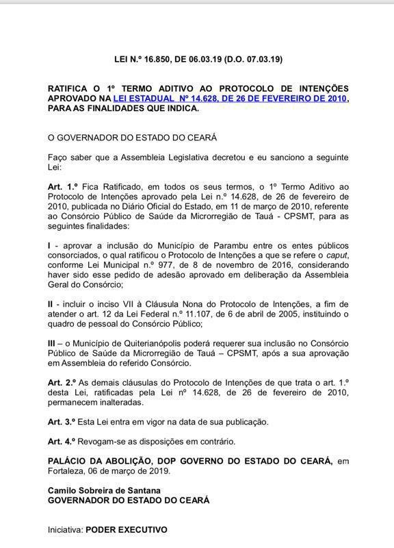 Ainda de acordo com o documento, passa a prevalecer a Lei 16.850 com a sanção do governador Camilo Santana em 06 de Março de 2019.