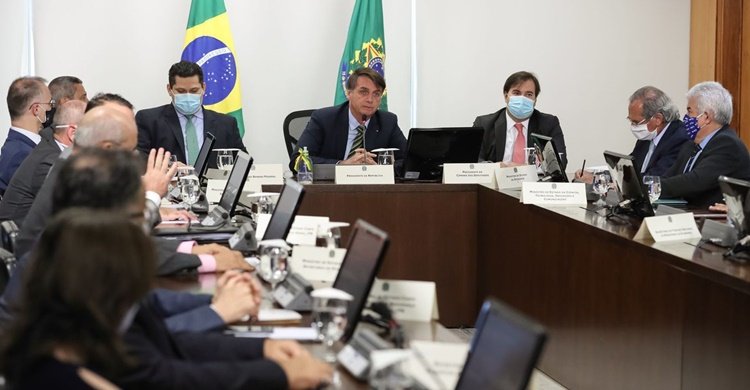 Os presidentes da Câmara dos Deputados, Rodrigo Maia (DEM-RJ), e do Senado, Davi Alcolumbre (DEM-AP), também participaram do encontro, ao lado de Bolsonaro e de ministros de Estado, a partir do Palácio do Planalto.
