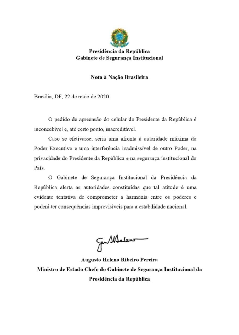 O Ministério do Gabinete de Segurança Institucional (GSI), comandado pelo general Augusto Heleno, divulgou nesta sexta-feira, 22, nota para se manifestar contra o pedido de apreensão do celular do presidente Jair Bolsonaro que foi encaminhado pelo STF à procuradoria-geral da República para manifestação.
