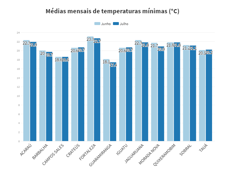 Em Fortaleza, por exemplo, de acordo com a climatologia, a temperatura máxima média durante os meses de verão, é de cerca de 31°C em fevereiro e de 30°C em junho. Em relação à temperatura mínima a variação é um pouco maior, a temperatura mínima média é de 24,5°C em fevereiro e de 23,1°C em junho.