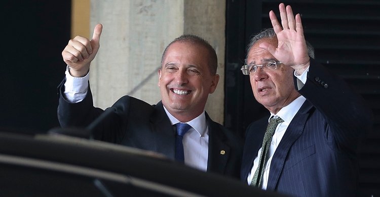 O ministro extraordinário da transição, Onyx Lorenzoni, e o futuro ministro da economia, Paulo Guedes, chegam ao gabinete do governo de transição no Centro Cultural Banco do Brasil (CCBB), em Brasília.Valter Campanato/Agência Brasil