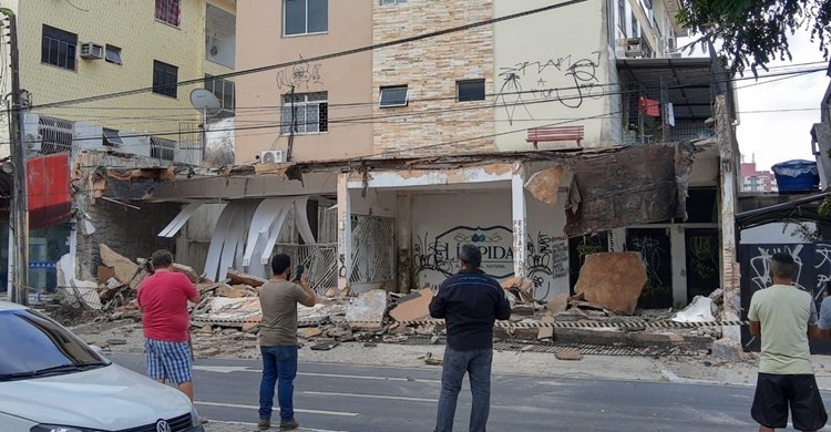 A área está isolada com fitas, ação que foi executada pela Polícia Militar. Além da escada do prédio, a calçada também ficou cheia de escombros.