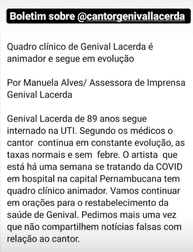 De acordo com a nota, “segundo os médicos, o cantor continua em constante evolução, com as taxas normais e sem febre. O artista, que está se tratando contra a Covid em hospital na capital Pernambucana, tem quadro clínico animador”. Genival está internado na UTI desde o último dia 30 de novembro para cuidados especializados.