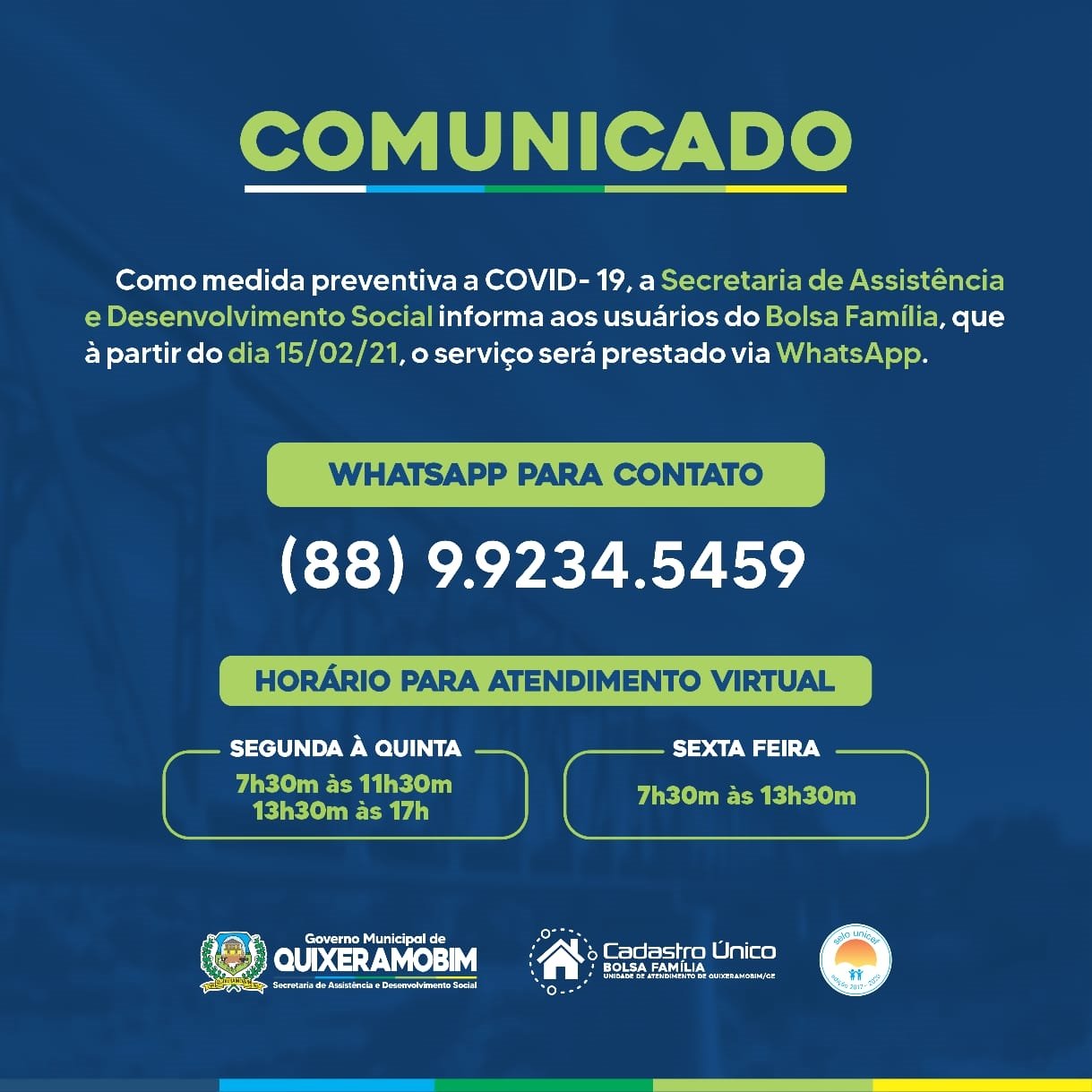A partir da próxima segunda-feira, 15 de fevereiro, a Secretaria de Assistência e Desenvolvimento Social de Quixeramobim, no Sertão Central, realizará o atendimento de usuários e beneficiários do Bolsa Família por meio do aplicativo WhatsApp.