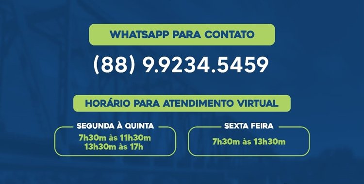 Para solicitar atendimento bastar entrar em contato com o número (88) 99234-5459, de segunda a quinta-feira, de 7h30min às 11h30min e 13h30min às 17h. Na sexta-feira o horário de atendimento será de 7h30min às 13h30min.