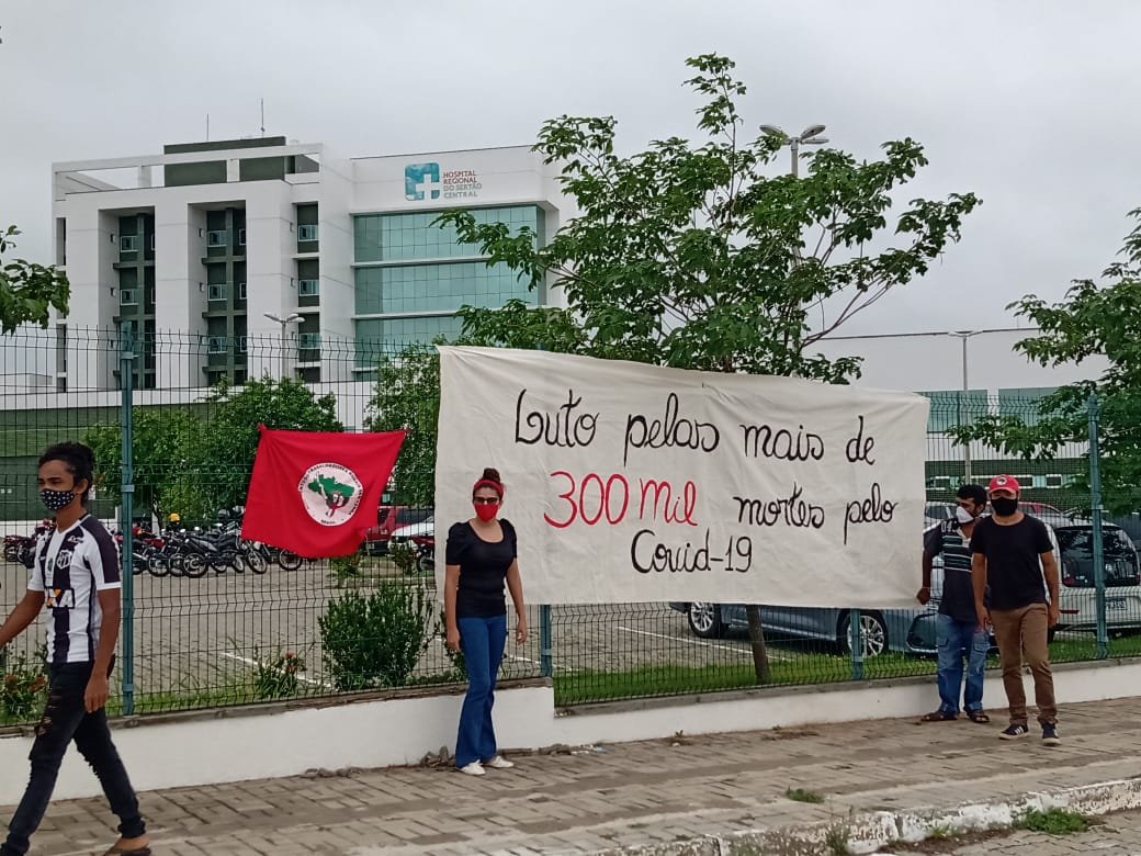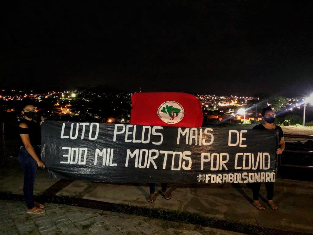O Movimento dos Trabalhadores Rurais Sem Terra realizou manifestação nessa quarta e nesta quinta-feira, 24 e 25/03, em luto pelas 300 mil vítimas da Covid-19 no Brasil, número alcançado ontem após a atualização dos óbitos. Atualmente, o País conta com 300.685 mortes pela doença.
