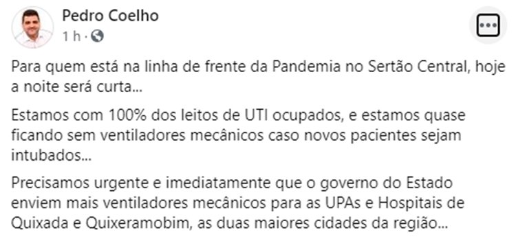 “Precisamos, urgente e imediatamente, que o governo do Estado envie mais ventiladores mecânicos para as UPAs e Hospitais de Quixadá e Quixeramobim”, solicitou Pedro, que ainda enfatizou: “Estamos com 100% dos leitos de UTI ocupados, e estamos quase ficando sem ventiladores mecânicos caso novos pacientes sejam intubados.”