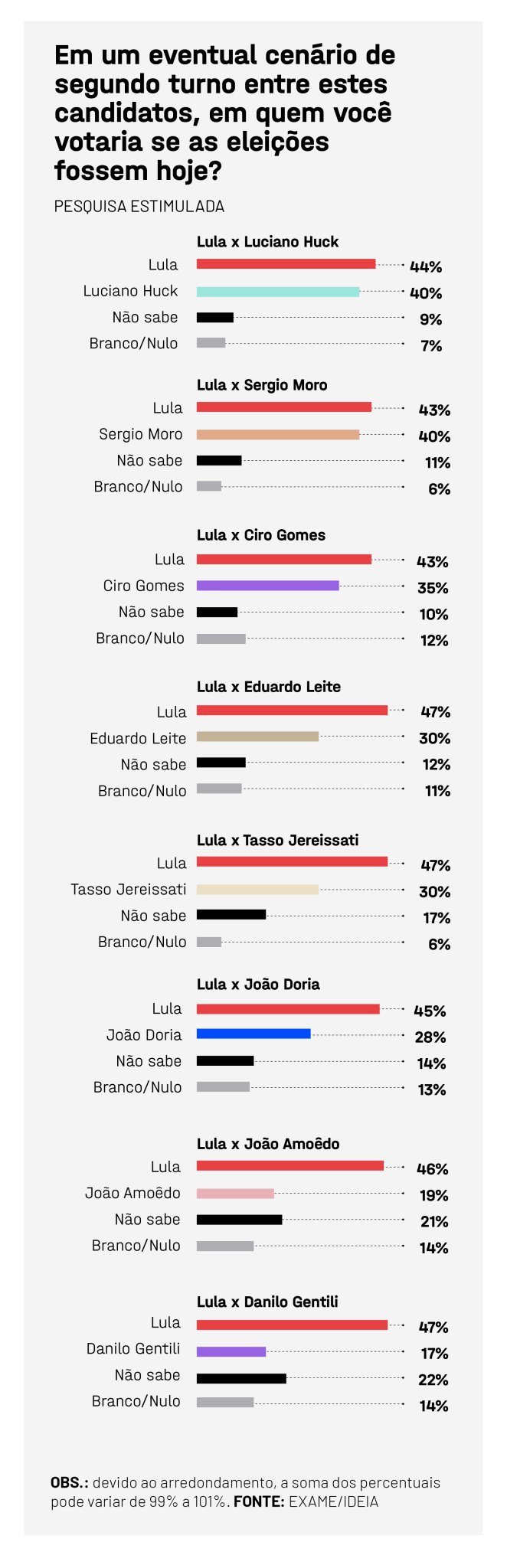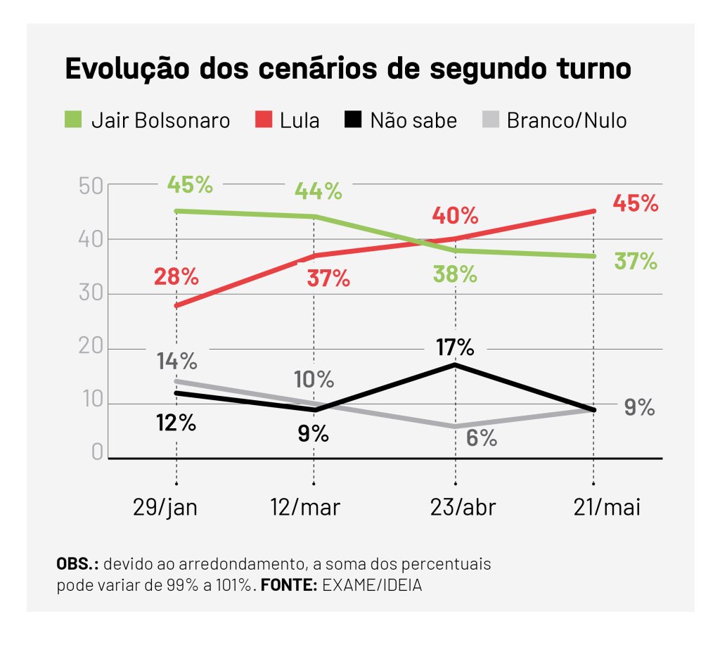 O ex-presidente Luiz Inácio Lula da Silva (PT) ampliou vantagem desde a última pesquisa de intenções de voto para 2022 realizada há um mês. É o que apontam os dados do levantamento EXAME/IDEIA, projeto que une Exame Invest Pro, braço de análise de investimentos da EXAME, e o IDEIA, instituto de pesquisa especializado em opinião pública.