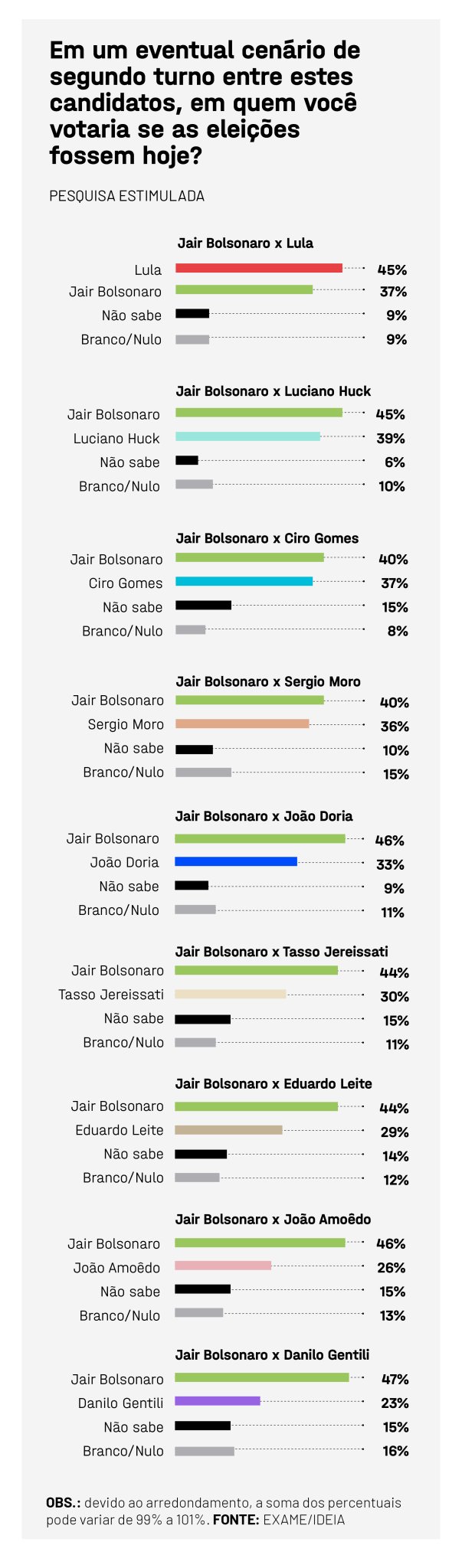 Em todos os cenários de segundo turno, qualquer candidato perde para Bolsonaro ou Lula. No entanto, o destaque vai para Ciro Gomes (PDT), que aparece com 37% em um segundo turno contra o atual presidente, que tem 40%. Na disputa com Lula, o petista tem 43%, e Ciro, 35%. A eleição mais acirrada de uma terceira via com Lula é contra o ex-juiz Sergio Moro (43% X 40%).