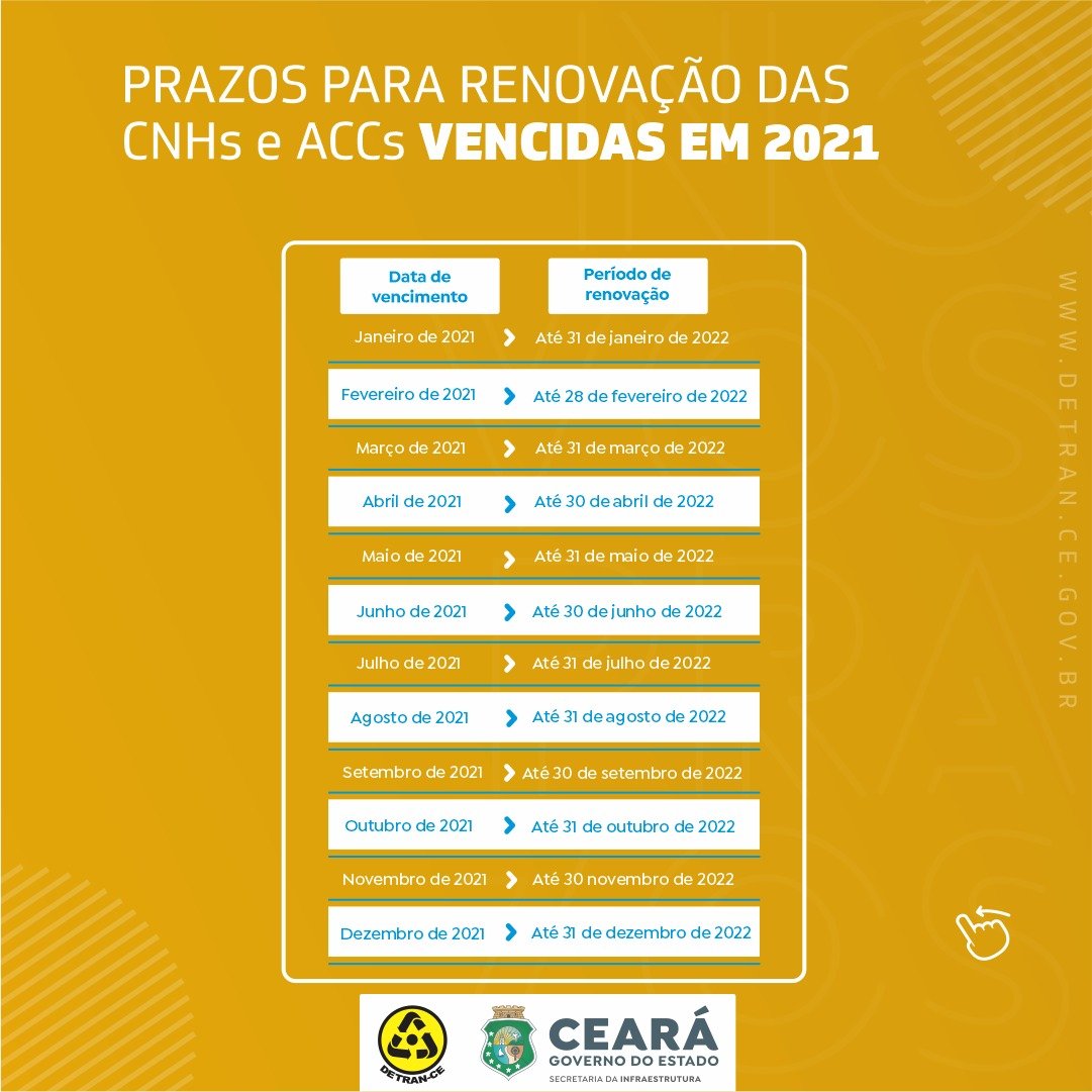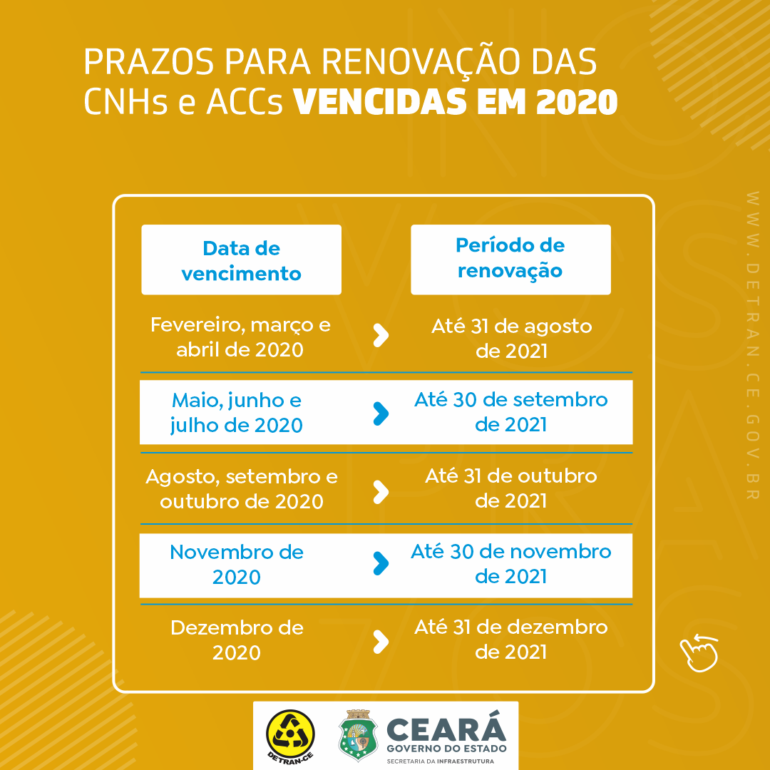 Condutores habilitados no Ceará e proprietários de veículos registrados no estado devem obedecer aos novos prazos, restabelecidos pelo Conselho Nacional de Trânsito (Contran), para renovação da Carteira Nacional de Habilitação (CNH), transferência e licenciamento, respectivamente.