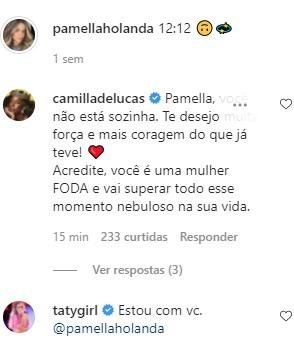 Diante do caso, diversos artistas e influenciadores já manifestaram posição em apoio a Pamella, como foi o caso da influencer Camilla de Lucas e da cantora Taty Girl.