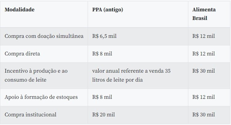 De acordo com o decreto, a partir de 1º de janeiro de 2022, o limite anual de valores pagos a unidades familiares para a aquisição dos alimentos vai aumentar em relação ao antigo programa, da seguinte forma: