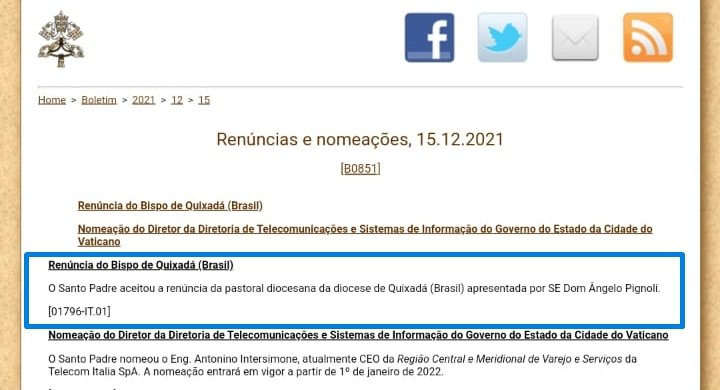 Nesta quarta-feira, 15, o Papa Francisco aceitou o pedido de renúncia de Dom Angelo Pignoli da Diocese de Quixadá, no Sertão Central. O sacerdote havia feito o pedido ao governo pastoral.