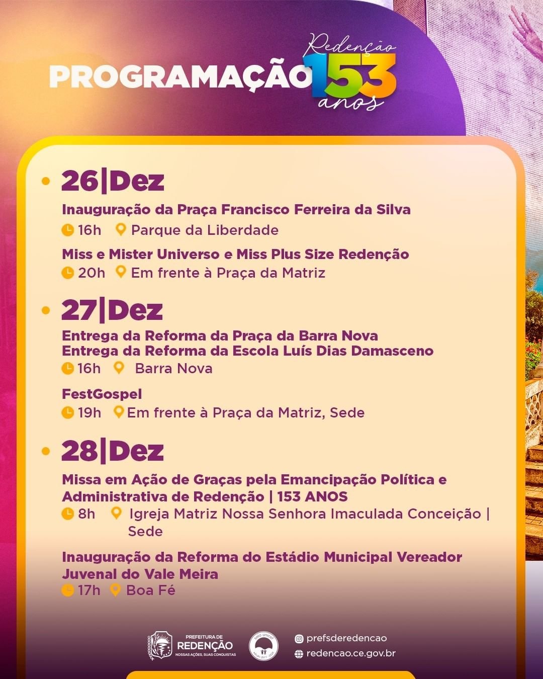 Neste domingo, 26, o município de Redenção abre as festividades em alusão aos 153 anos de emancipação política. A programação se estenderá até a próxima terça-feira, 28.