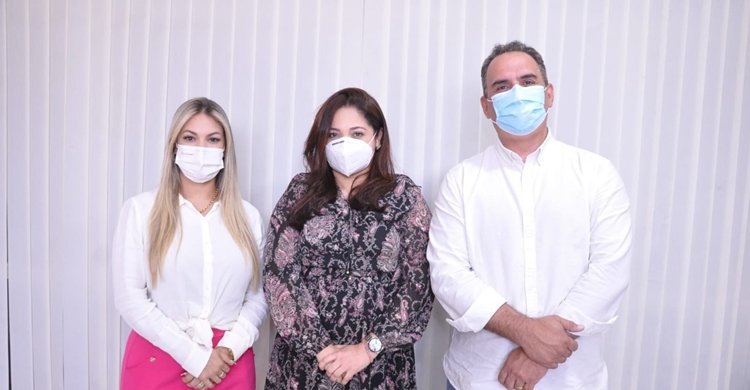 Da esquerda para a direita: Iáskara Silveira, primeira-dama; Lady Arruda Mota, nova secretária de saúde de Quixadá, e Ricardo Silveira, prefeito