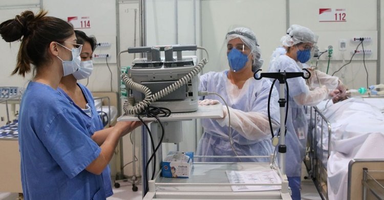 Médicos fazem treinamento no hospital de campanha para tratamento de covid-19 do Complexo Esportivo do Ibirapuera.