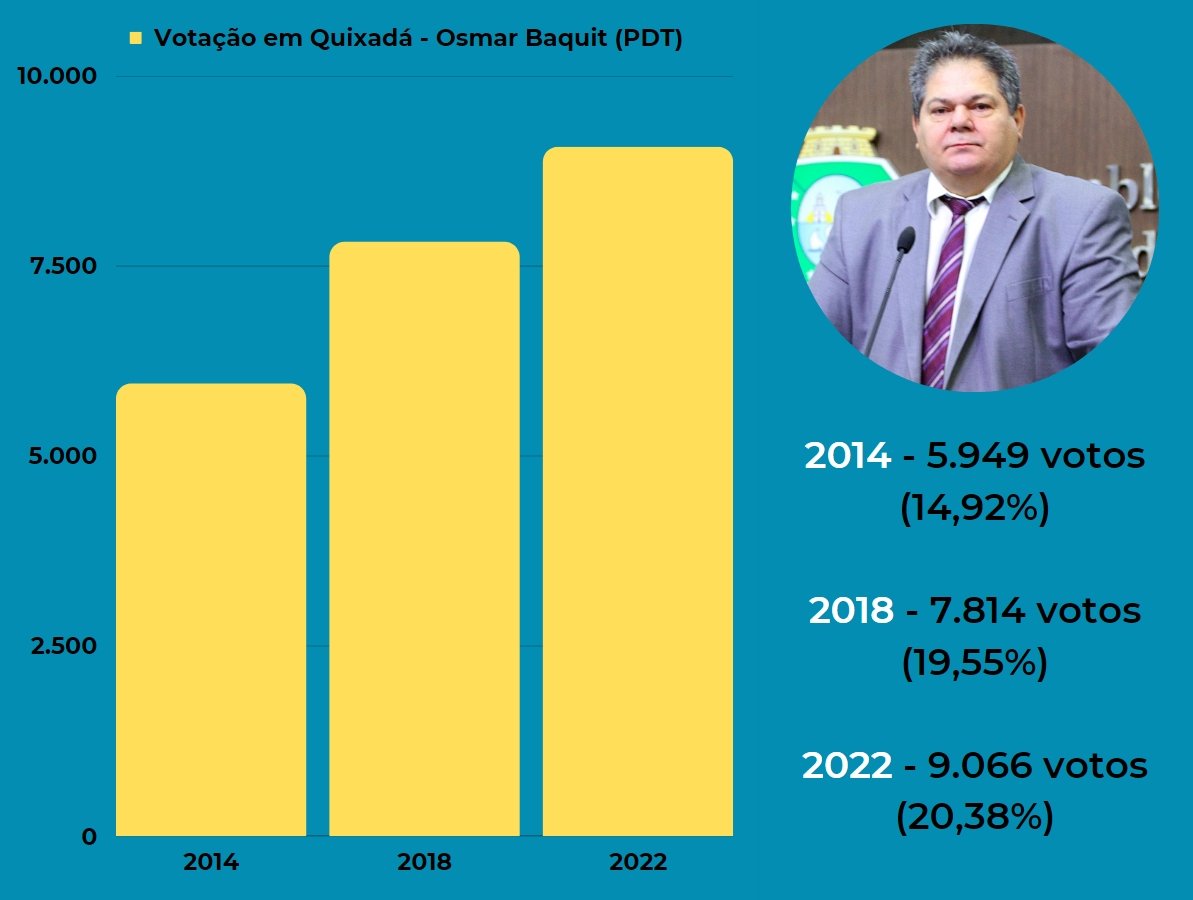Em levantamento feito pelo Repórter Ceará junto ao Tribunal Regional Eleitoral do Ceará (TRE-CE), Baquit vem apresentando crescimento em votos em seu domicílio eleitoral, passando de 14,92% dos votos válidos em 2014 – quando ficou em segundo lugar na cidade – para 20,38% em 2022.
