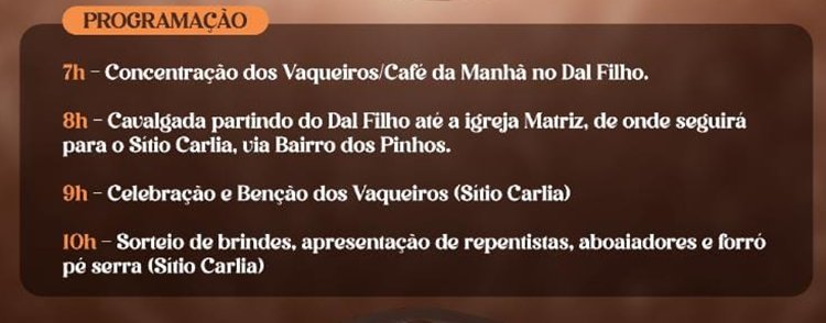 A programação será iniciada às 7h, com a concentração dos vaqueiros e café da manhã, e se encerrará às 10h, com sorteio de brinde, apresentação de repentistas e forró. Confira: