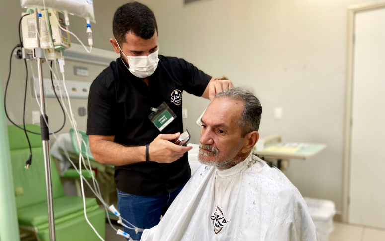 A equipe trouxe um cabeleireiro para o HRSC e, no dia do seu aniversário, o paciente ganhou um corte de cabelo e teve a barba feita. “A gente viu o quanto ele mudou. Foi incrível ver a felicidade dele”, complementa Wesley. Seu João concorda: “Para mim foi bom demais. Eu nem estava sabendo. De repente, chegou todo mundo para cortar meu cabelo. Pessoal aqui é muito legal, não me falta nada”, comenta.