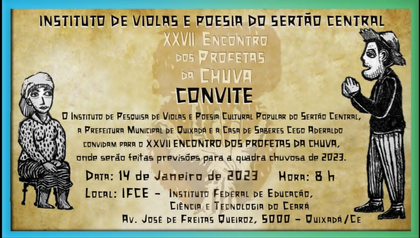 O município de Quixadá, no Sertão Central, se prepara para sediar no dia 14 de janeiro, a 27ª edição do Encontro dos Profetas da Chuva. O evento acontecerá no Instituto Federal de Educação, Ciência e Tecnologia do Ceará (IFCE), momento em que vários profetas se reunirão para apresentar resultados obtidos pela observação da natureza e seus fenômenos, que devem indicar como será a quadra invernosa em todo o estado em 2023.