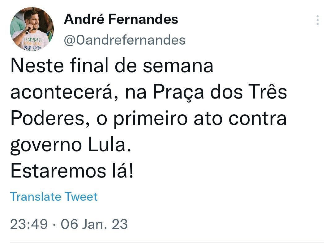As postagens foram apagadas nos perfis de André Fernandes após a repercussão negativa dos atos golpistas em Brasília, no entanto, prints foram registrados e comprovam os tuítes de Fernandes. Ele também alterou o link de identificação no Twitter, o que remove o selo de conta verificada da rede social.