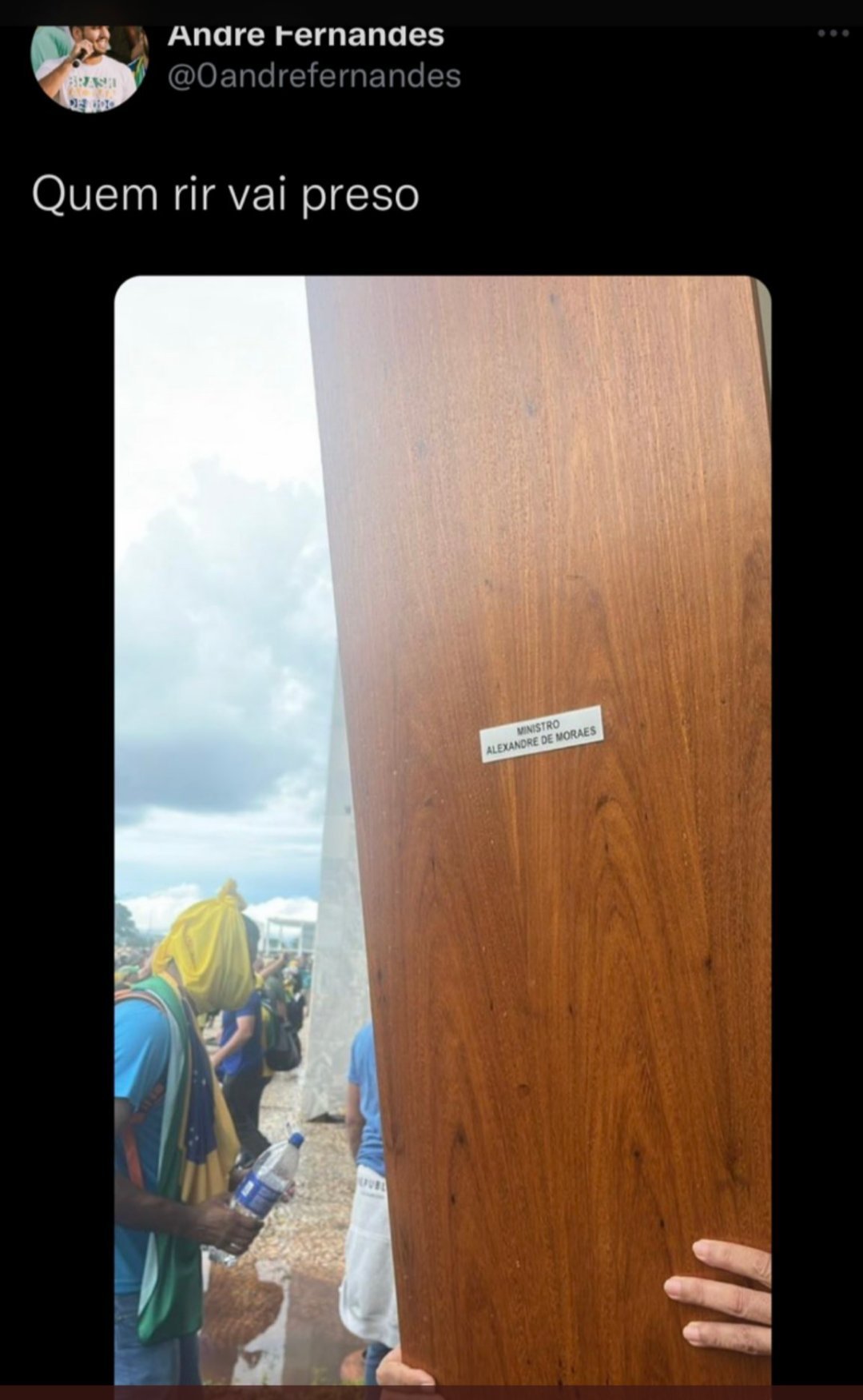 Após a invasão ao STF, André postou nas redes sociais a imagem da porta do gabinete com o nome do ministro Alexandre de Moraes, com a seguinte legenda: “Quem rir vai preso”.